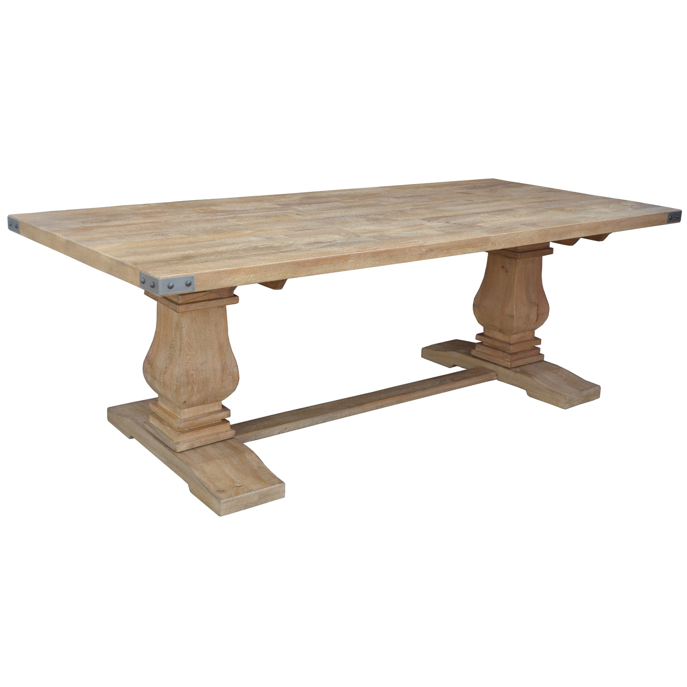 The ornate baluster legs and distinctive metal corner details add a touch of grandeur and craftsmanship, allowing it to blend seamlessly into both classic and contemporary décors. Renowned for its beauty and durability, this low-maintenance table is built to be a lasting centrepiece for your home. It arrives in two boxes for straightforward assembly and is backed by a 1-year warranty, making every dinner an occasion.